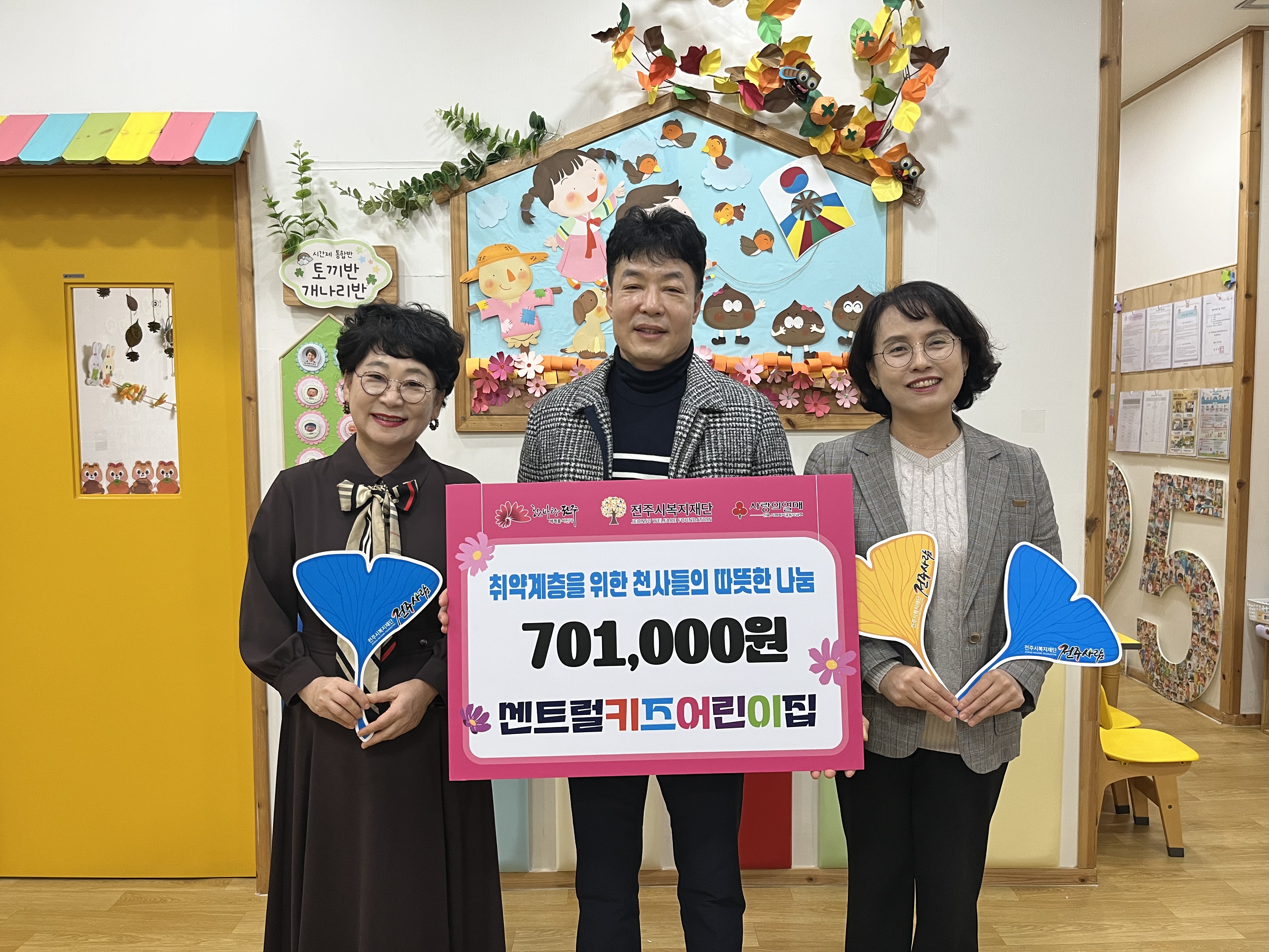 센트럴키즈어린이집이 아이들과 학부모가 함께 참여한 나눔장터 수익금 701,000원을 지역 취약계층 지원을 위해 전주시복지재단 전주사람에 전달했습니다.