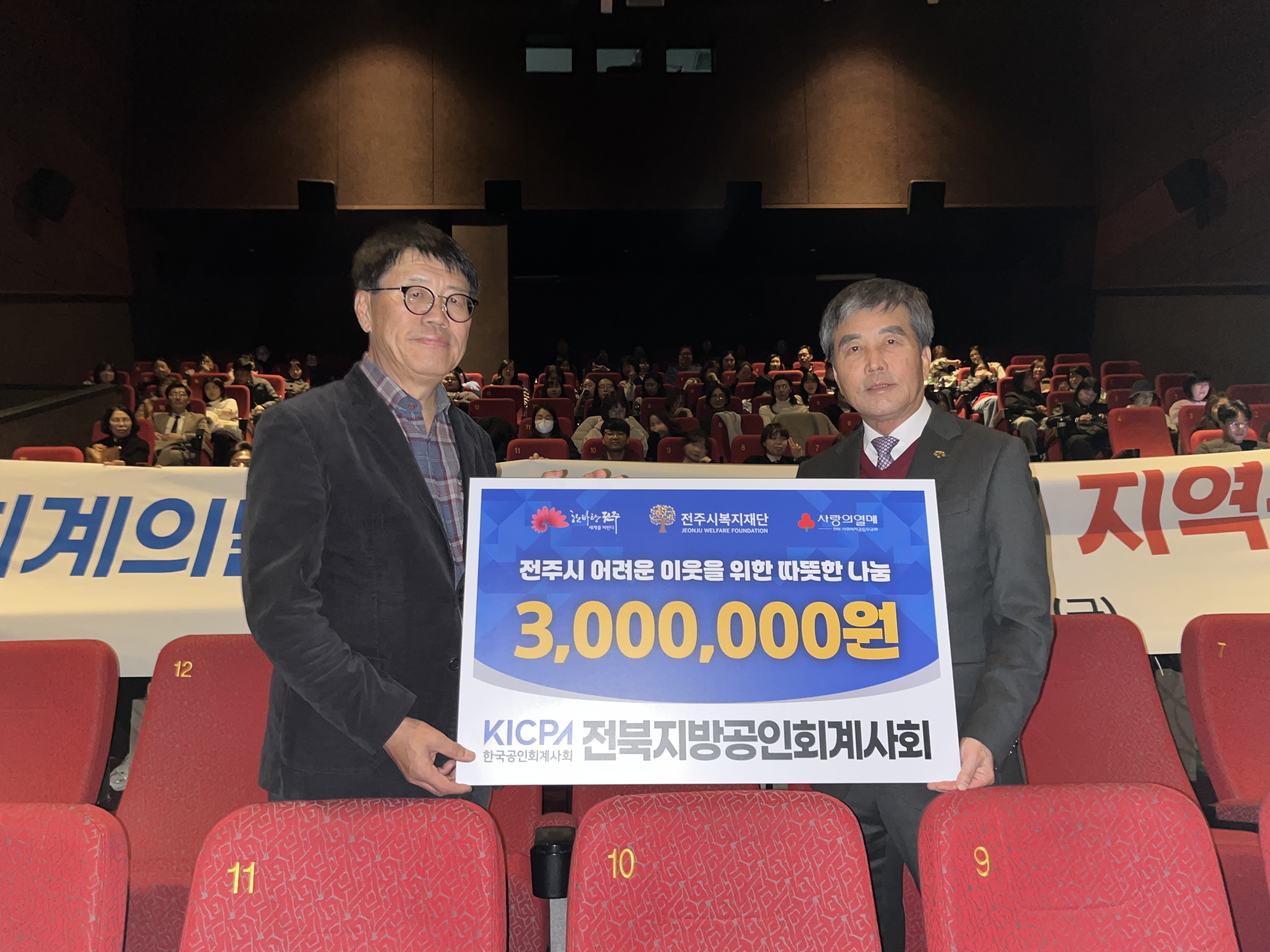 전북지방공인회계사회(회장 박경기)가 28일 전주시복지재단 전주사람에 혹한기로 어려움을 겪는 시민들을 돕기 위한 성금 300만 원을 전달했다.
