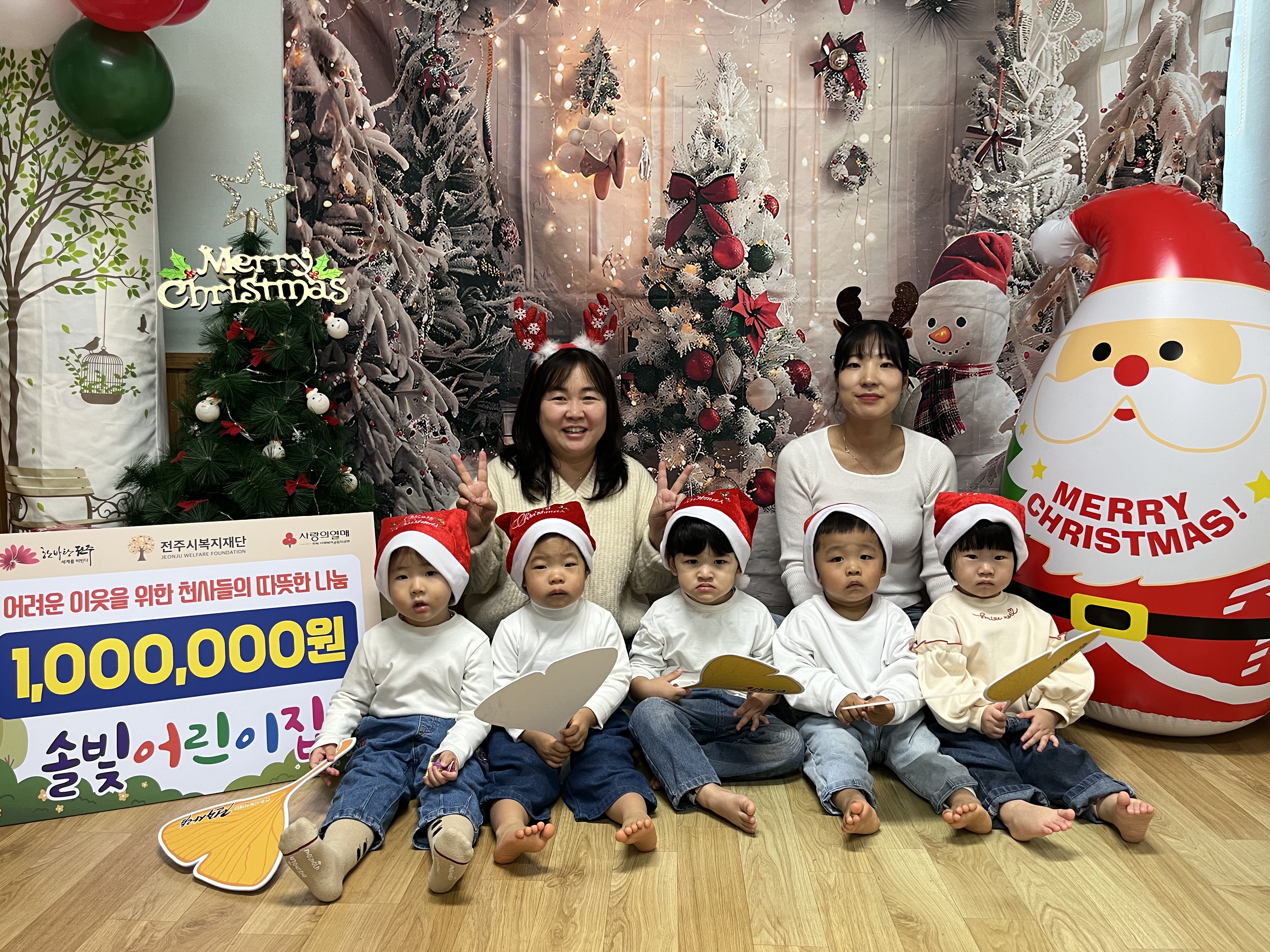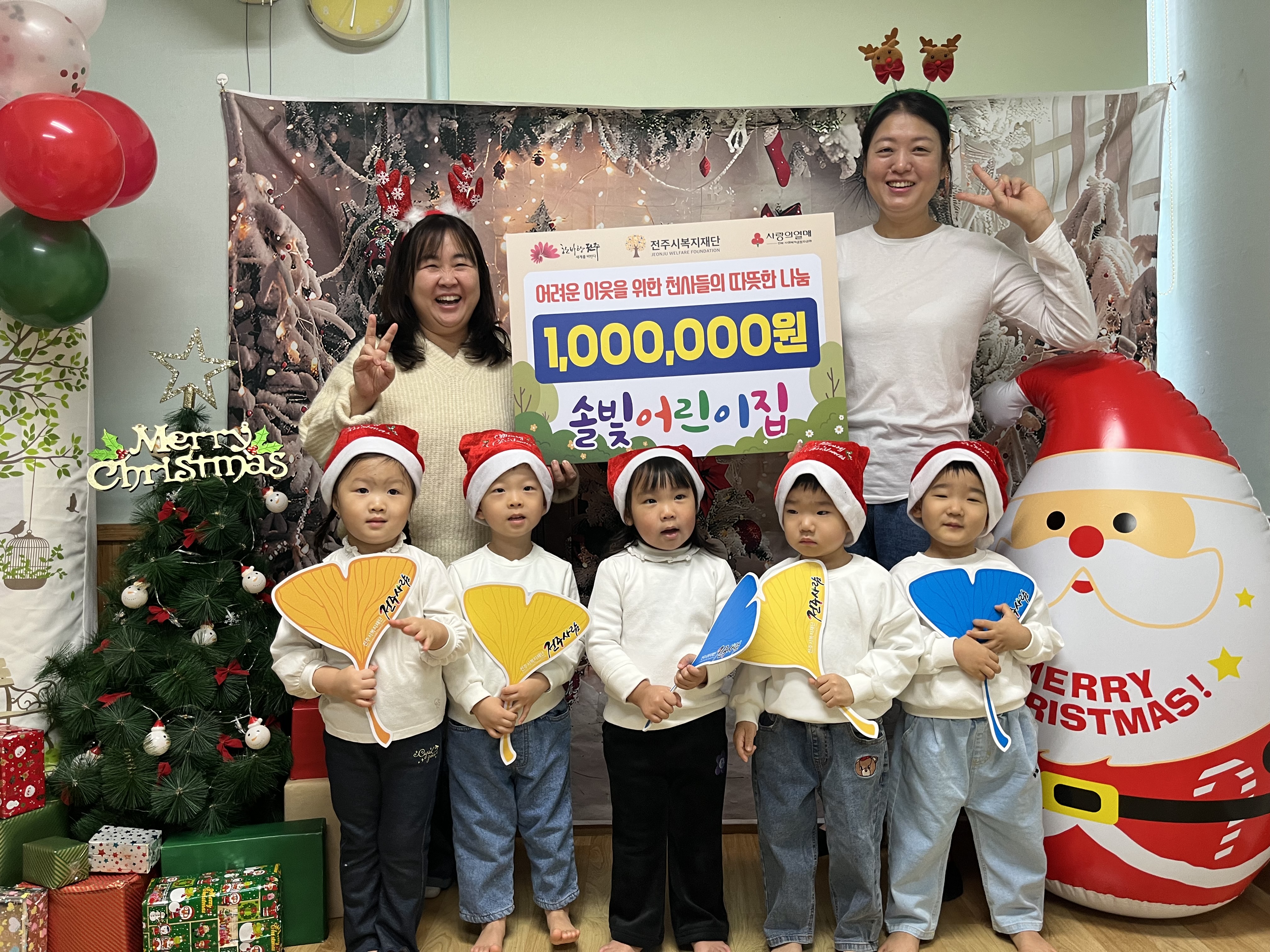 솔빛어린이집 원아들과 학부모가 함께한 바자회 수익금 전액, 성금 100만 원이 복지 사각지대 이웃을 위해 전주시복지재단에 전달해주셨습니다.