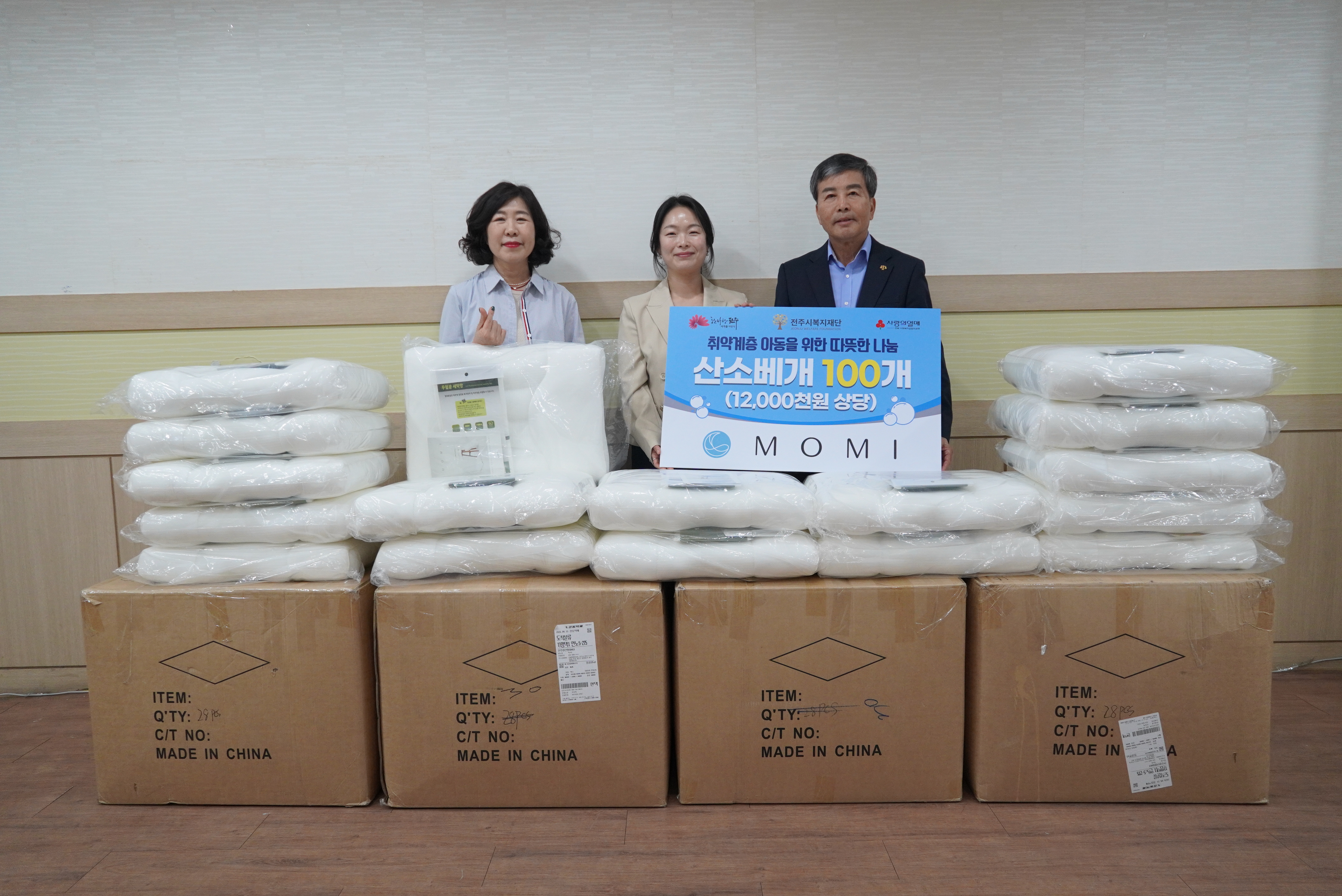 모미에서 성장기 아동·청소년의 건강한 수면을 위해 기능성 ‘산소베개’ 100개를 전주시복지재단에 기부했습니다