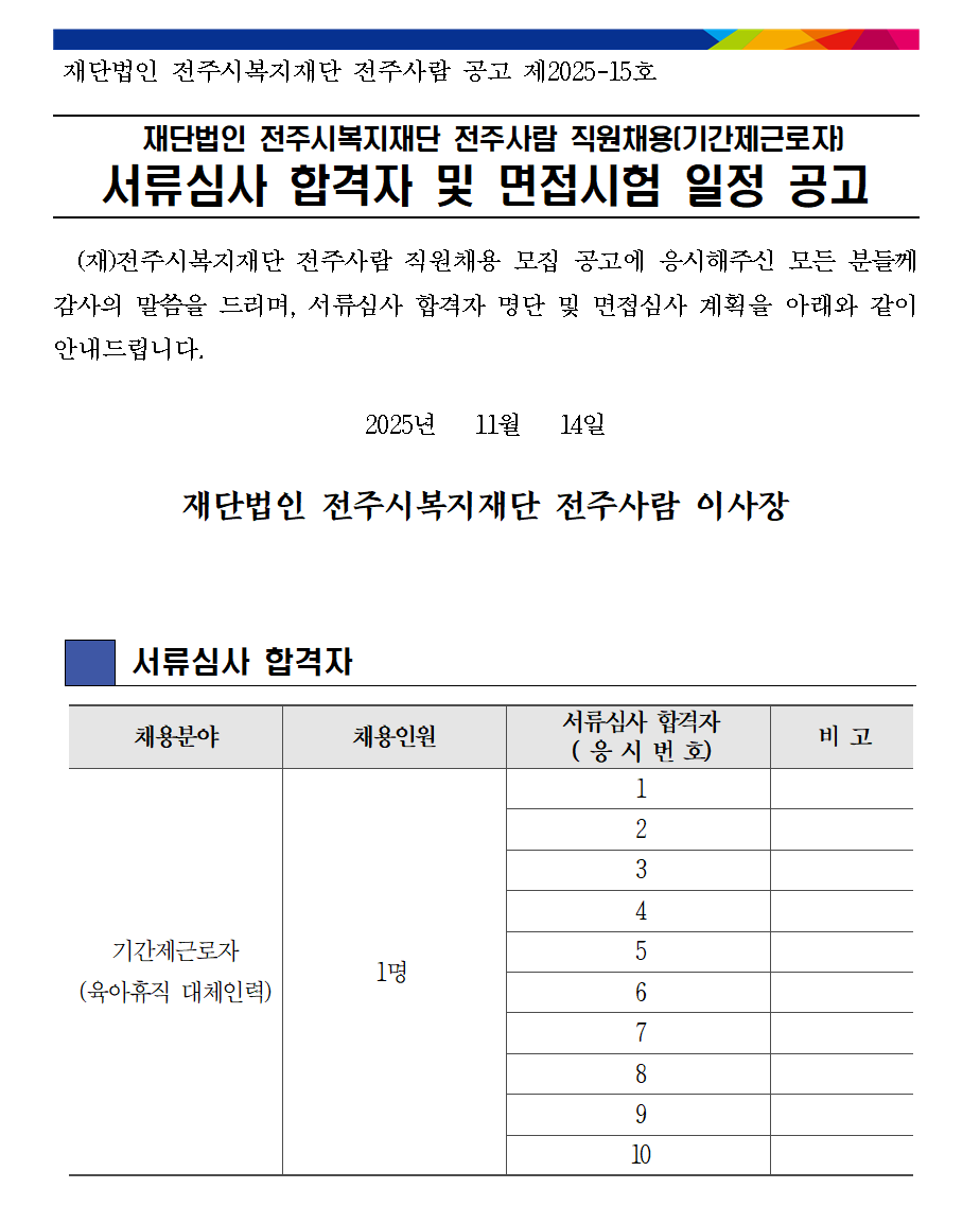 [서류심사 합격자 및 면접심사 안내] ※ 면접 참석 전 반드시 첨부서류를 확인하시기 바랍니다. 첨부된 안내문에는 면접일정, 장소, 제출서류, 유의사항 등이 포함되어 있으며, 누락 시 면접 심사에 제한이 있을 수 있습니다. 반드시 내용을 확인하시어 면접 준비에 착오 없으시기 바랍니다.
