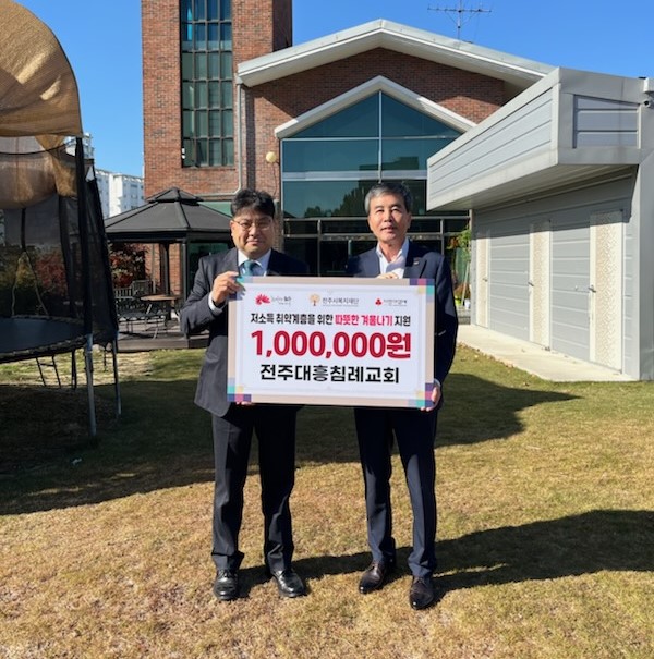 전주대흥침례교회가 14일 전주시복지재단에 성금 100만 원을 기부하며 취약계층의 월동 지원에 나섰다.